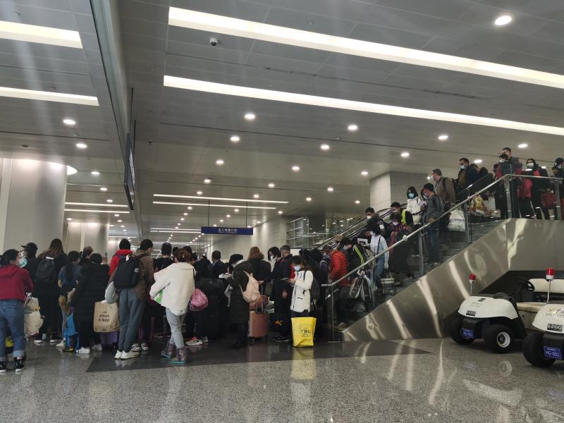 下午2時30分,記者看到,俄航某進境航班旅客正在國際到達區域進行健康申報、測溫等工作。旅客們從下飛機到完成各個排查流程,可能需要數個小時。而后續航班即便已經抵達,旅客或許也暫時無法下機,他們要等到前道航班完成所有檢疫排查之后才能開啟進境申報流程。記者看到,雖然旅客等候的時間很長,但他們多非常配合,而衛生檢疫一線的海關關員面對長長的隊伍以及后續可能要排查到半夜的航班,其嚴防嚴控力度絲毫不松。非常時期,安全與便利,不應有所調和。
